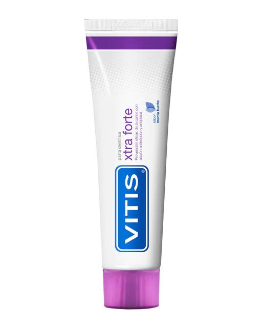 La pasta dentífrica Vitis Xtra Forte sabor menta fuerte está diseñada para asegurar la máxima higiene bucal, siendo apta para personas celíacas. Su potente acción antiséptica y antiplaca proporciona una higiene total y está especialmente formulada para prevenir la formación de placa bacteriana (biofilm oral). El refrescante sabor a menta fuerte prolonga la sensación de frescor e higiene.